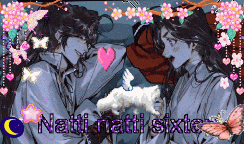 Hua Cheng and Xie Lian share a tender moment, surrounded by hearts and butterflies, wishing 'Natti Natti'.