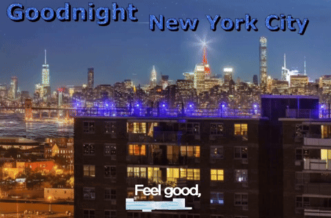 A serene night view of the New York City skyline with a comforting message to 'Feel good, sleep well.'