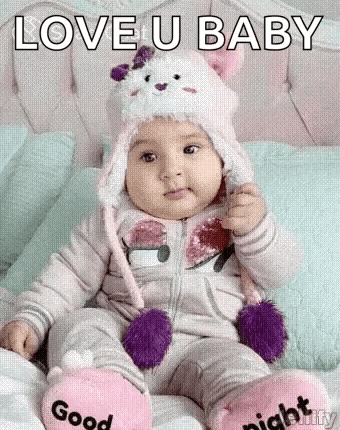 Adorable baby in a cute animal hat and 'Good night' slippers, wishing everyone sweet dreams.