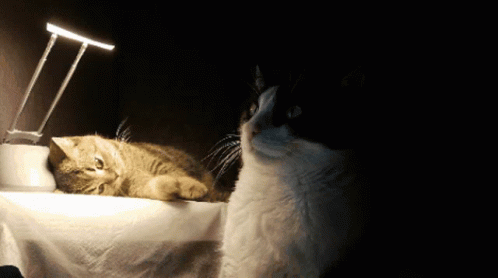 Two cats in a dimly lit room, one sleeping under a lamp, the other awake and observing.