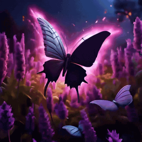 A beautiful black butterfly with glowing pink wings in a field of purple flowers, with a Russian good night message.
