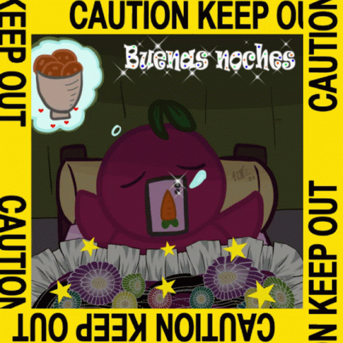 An animated purple fruit sleeping peacefully, surrounded by a 'Caution Keep Out' border, wishing 'Good Night'.