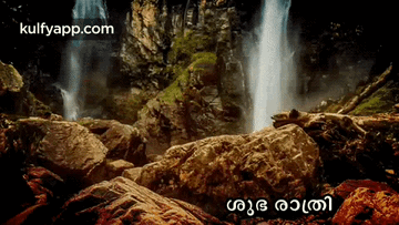 A serene waterfall scene with an inspiring Malayalam good night message about hard work, respect, and humility.