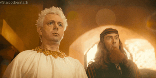 Aziraphale and Bildad the Shuhite from Good Omens look confused and perplexed, with wide eyes.