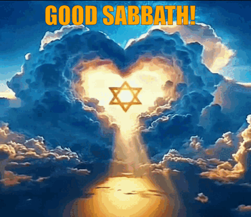 An image wishing 'Good Sabbath!' with a heart-shaped cloud, a glowing Star of David, and rays of light.