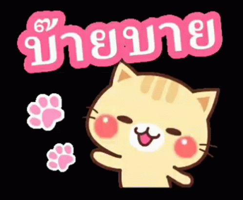 Adorable yellow tabby cat sticker waving goodbye with pink paw prints and Thai text 'บ๊ายบาย'.