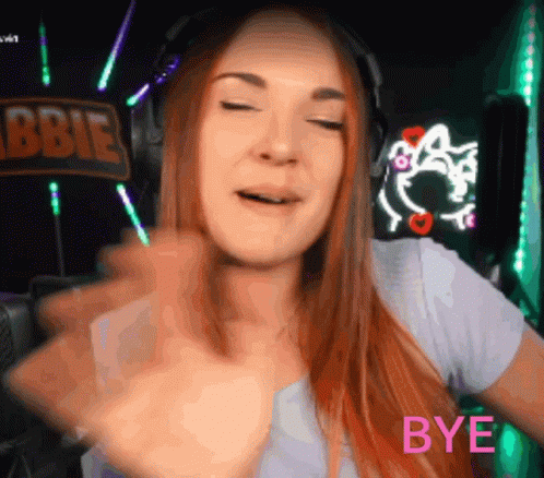 Gabbietv waves goodbye to her viewers with a smile, wearing headphones in a neon-lit room.
