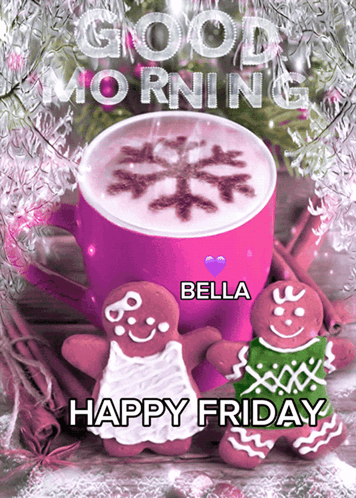 Good Morning Bella! Festive gingerbread men and a cozy coffee with a snowflake, wishing a Happy Friday.