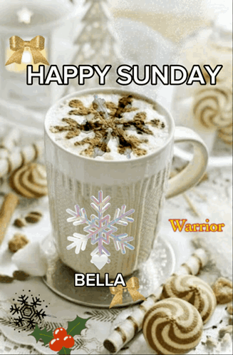 A festive 'Happy Sunday' greeting featuring a coffee cup with a snowflake design, surrounded by holiday decor and the name Bella.
