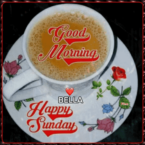 A warm cup of coffee with 'Good Morning Bella Happy Sunday' message, perfect for a relaxing start.
