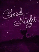 A peaceful image featuring 'Good Night' text on a starry purple background, with a small cat silhouette.