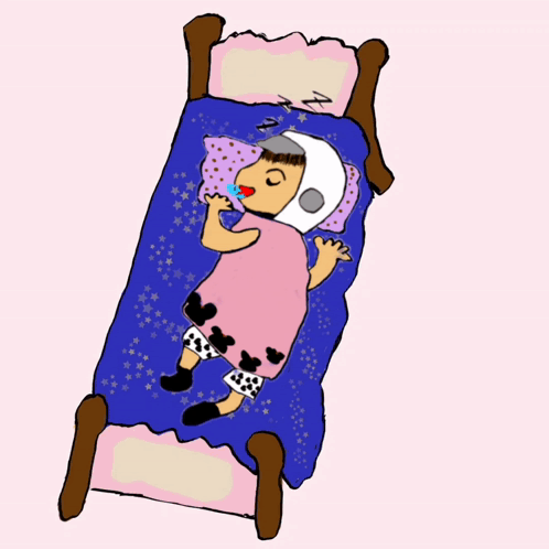 Cute cartoon character sleeping soundly in bed, wishing 'Goodnight' in multiple languages.