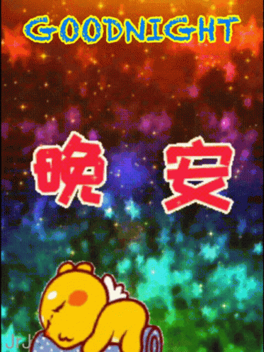 Cute Qoobee cartoon character sleeping under a crescent moon with 'Goodnight' and '晚安' messages.