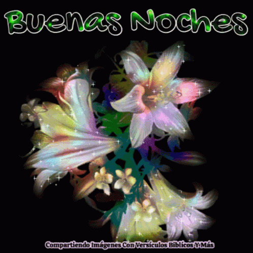 A beautiful animation wishing 'Buenas Noches' (Goodnight) with sparkling flowers on a black background.