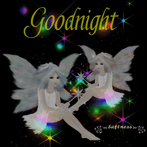 Two enchanting fairies from Julee San's collection wish you goodnight amidst sparkling stars and magical glow.