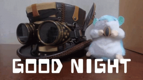 A cute hamster plushie falls asleep next to a steampunk hat, wishing everyone a good night.