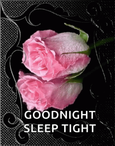 Two beautiful pink roses with the message 'Goodnight Sleep Tight' on a dark, ornate background.