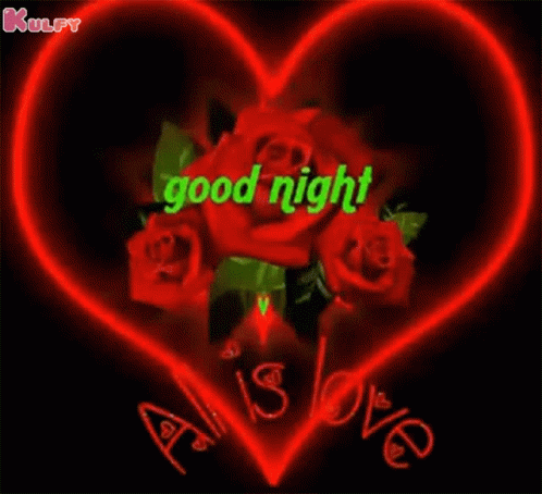 Animated goodnight greeting with a glowing red heart, roses, and 'All is love' message.