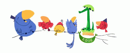 A vibrant Google Doodle from 2016 featuring a group of colorful cartoon birds celebrating on a branch.