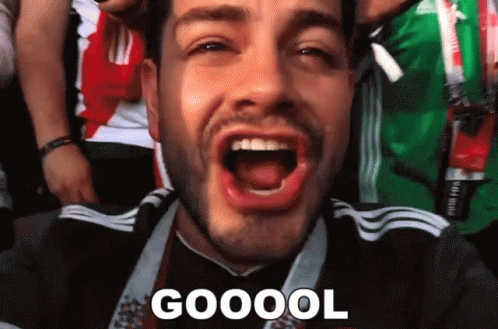 Benshorts passionately screams 'GOOOOL' while celebrating a goal at the World Cup, surrounded by excited fans.