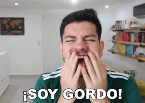 A man covers his face in distress with the caption 'I AM FAT!', reflecting feelings about being overweight.