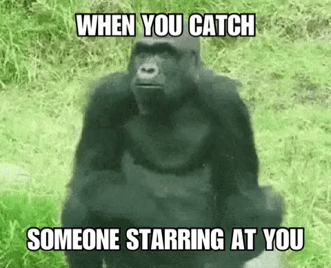 A gorilla's hilarious reaction when it catches someone staring at it, featuring a surprised open-mouth expression.
