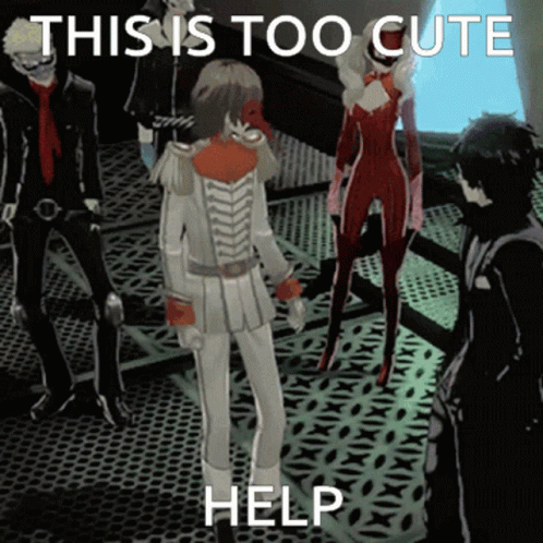 Goro Akechi from Persona 5 in a 'too cute' moment, surrounded by other characters, with overlaid text 'THIS IS TOO CUTE HELP'.