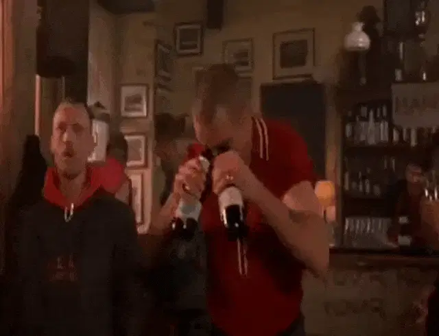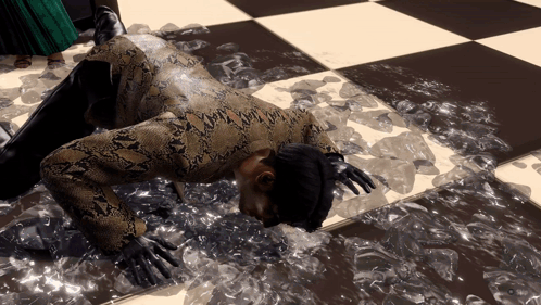 Goro Majima, after crawling on the floor, dramatically rises with Koyuki and Yuki in a 4shine club.