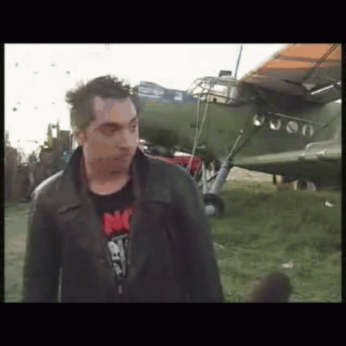 A man, possibly Gorshok, walks past an old biplane and agricultural machinery in an outdoor setting.