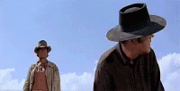Two men in hats stand in a desert landscape, one in the foreground and another in the distance.