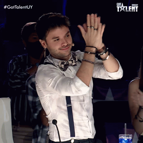 Agustin, wearing a bow tie and suspenders, applauds enthusiastically at Got Talent Uruguay.