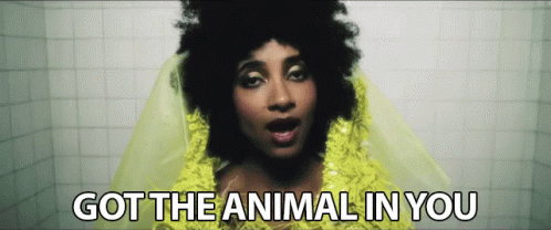 Esperanza Spalding in a vibrant yellow outfit, with the text 'Got The Animal In You' displayed.