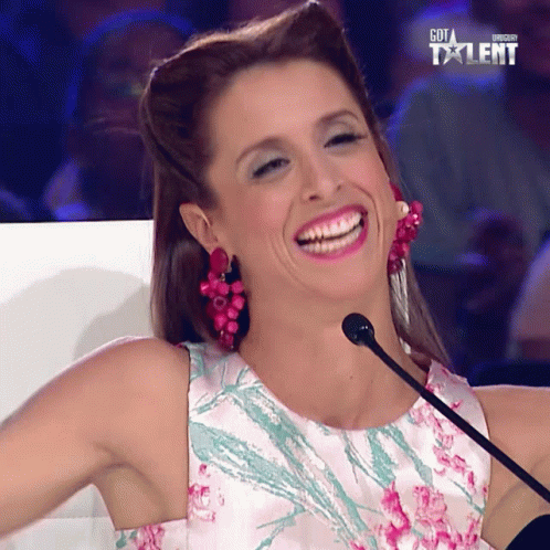 A judge from Got Talent Uruguay bursts into laughter while seated at the judging panel with a microphone.
