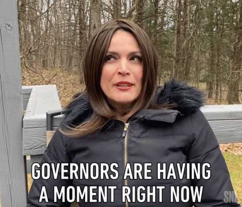 Cecily Strong as a governor in a black jacket, delivering the line 'Governors Are Having A Moment Right Now' from SNL.