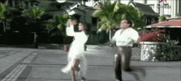 Govinda and Raveena dancing energetically outdoors on a paved area, with houses and palm trees in the background.