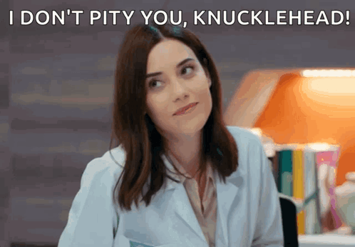 Woman in a lab coat, identified as Gözde Seda Altuner or Cansu Dere, smirks and says 'I don't pity you, knucklehead!'