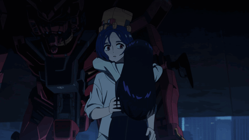 Two girls embrace in front of a large red mech, one appearing to push away while the other holds on.