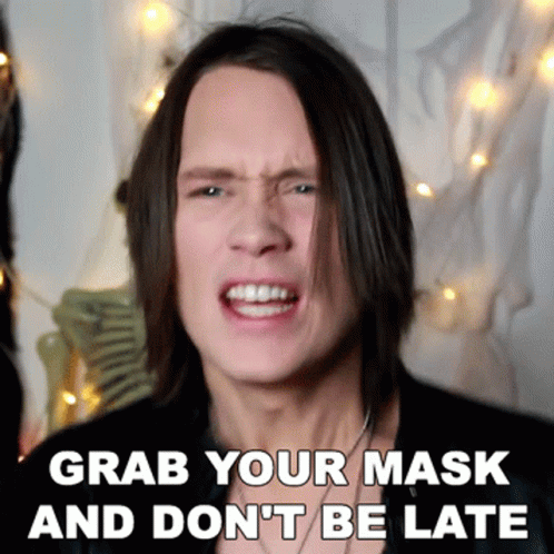 Pellek sings "Grab Your Mask And Don't Be Late" with an expressive face and Halloween decorations.
