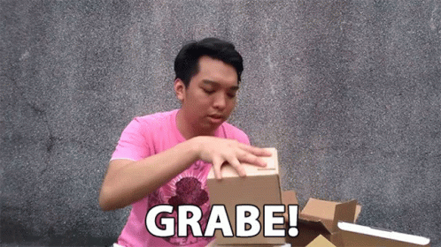 A man in a pink shirt excitedly unboxes a package, exclaiming 'Grabe!' in surprise.