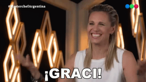 Denise Dumas expresses gratitude with a big smile and '¡Graci!' on Masterchef Argentina.