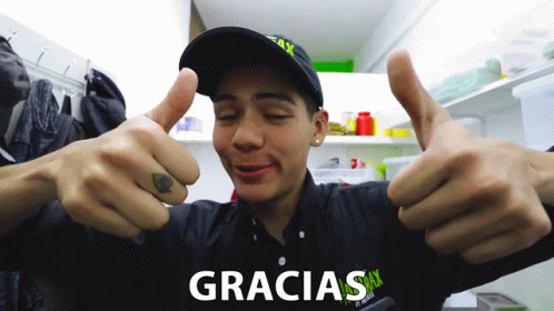 A man gives a double thumbs up to the camera with the word "Gracias" (Thanks) displayed on screen.