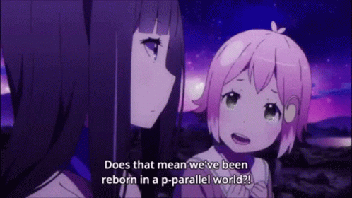 Two anime girls from Granbelm discuss being reborn in a parallel world, with one excitedly asking and the other denying.