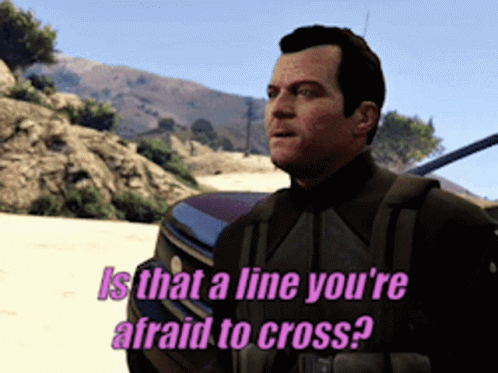 Michael De Santa from Grand Theft Auto V asks, 'Is that a line you're afraid to cross?' in this intense game moment.