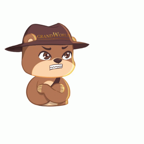 The Grand World Phú Quốc Teddy Bear character, wearing its signature hat, breathes fire in an angry outburst, exclaiming 'ARGHHHH'.