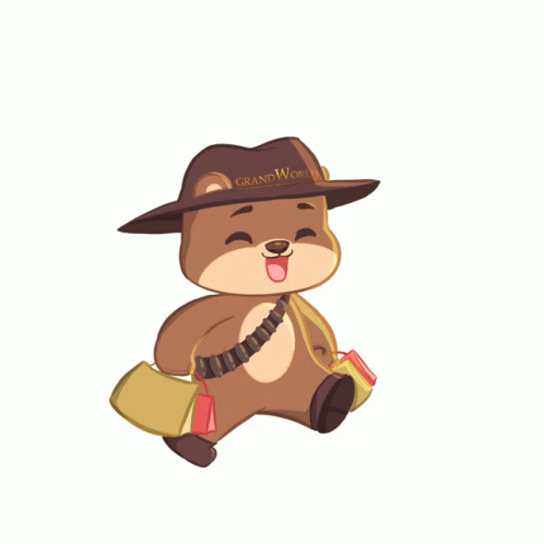 Grand World Phú Quốc's cheerful teddy bear mascot, wearing a hat and bandolier, happily carries shopping bags.