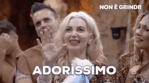 A woman from Grande Fratello Vip, possibly 'marchesa', reacts with an 'Adorissimo' expression, smiling and waving.