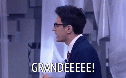 Valerio Lundini enthusiastically exclaims 'GRANDEEEEE!' in a studio setting, wearing a suit and tie.