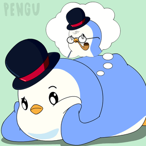 Grandpa Gramps penguin rests on a larger pudgy penguin, both wearing top hats.