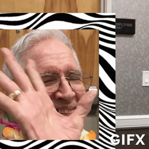 Grandpa Judson Keating waves cheerfully at a Key West luau party, wearing glasses and a lei.