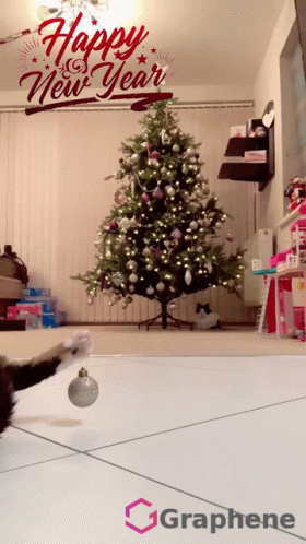 A festive cat plays with a Christmas ornament, then poses in a Santa hat and sunglasses, with a decorated tree and "Happy New Year" message.